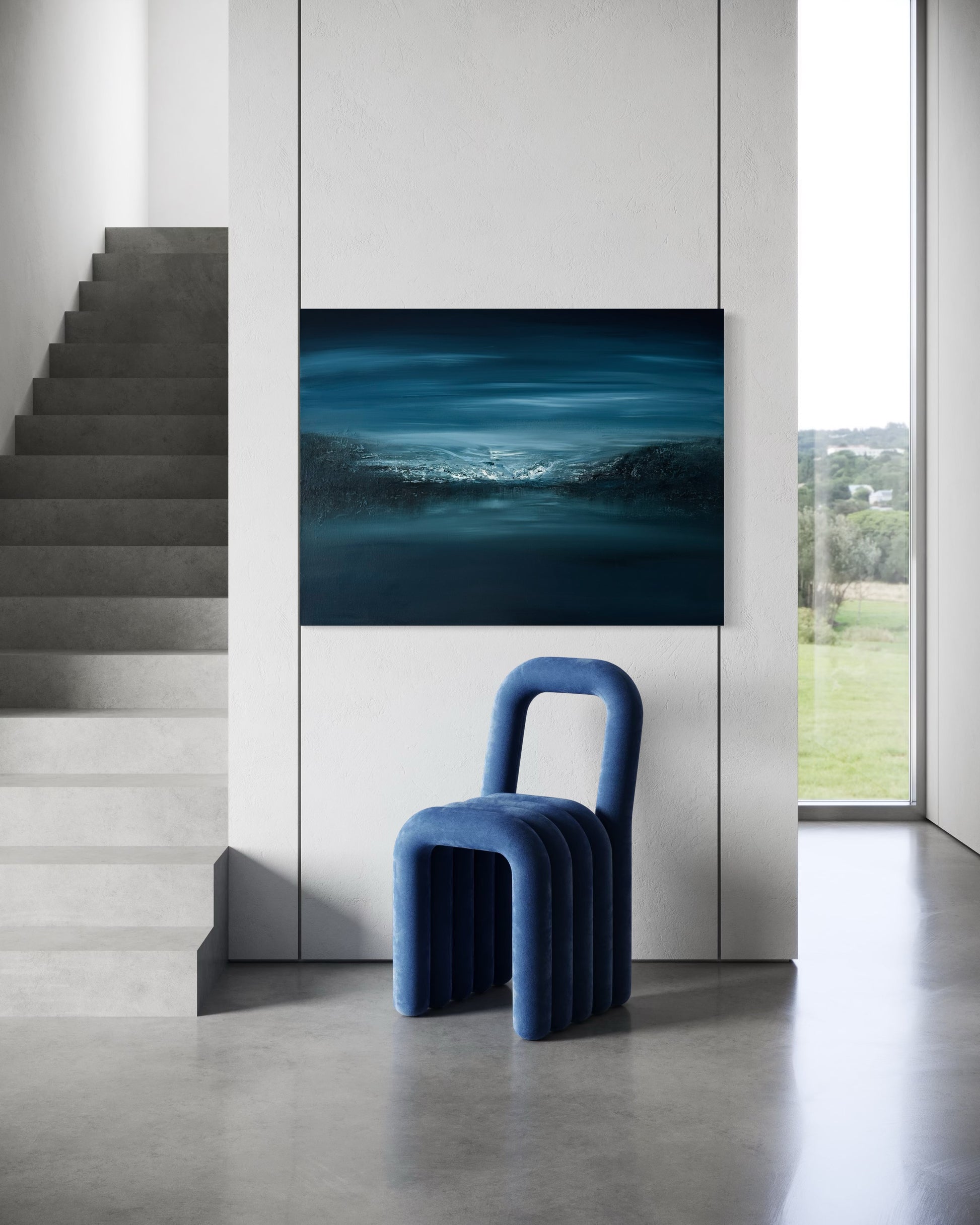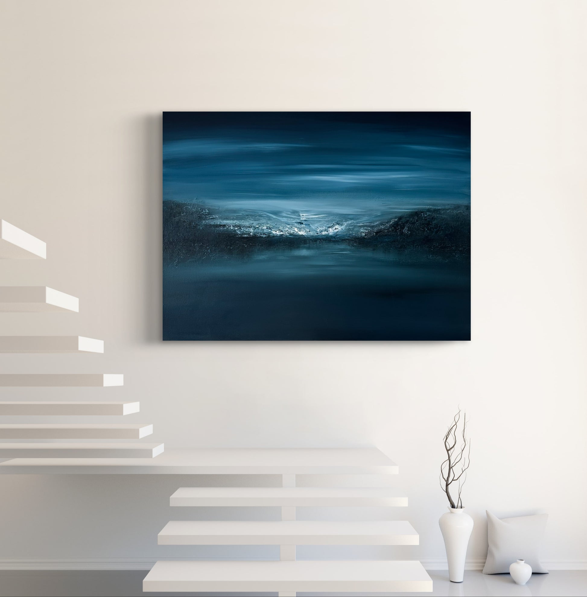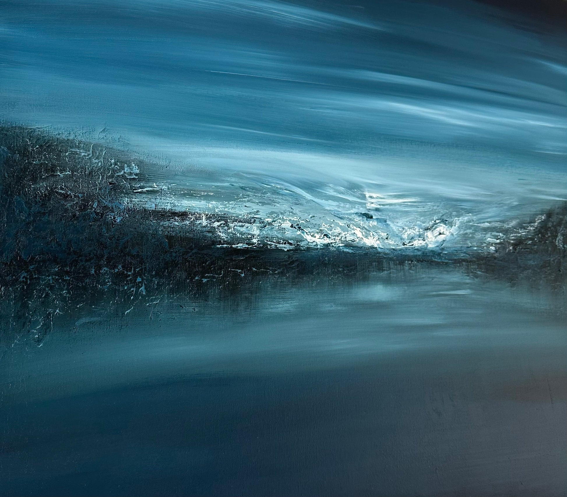 ‘A quiet, contemplative moment captured in layered blue tones and textured strokes — Northern Silence evokes the stillness of distant horizons and deep water. This original piece invites calm into any modern space.’