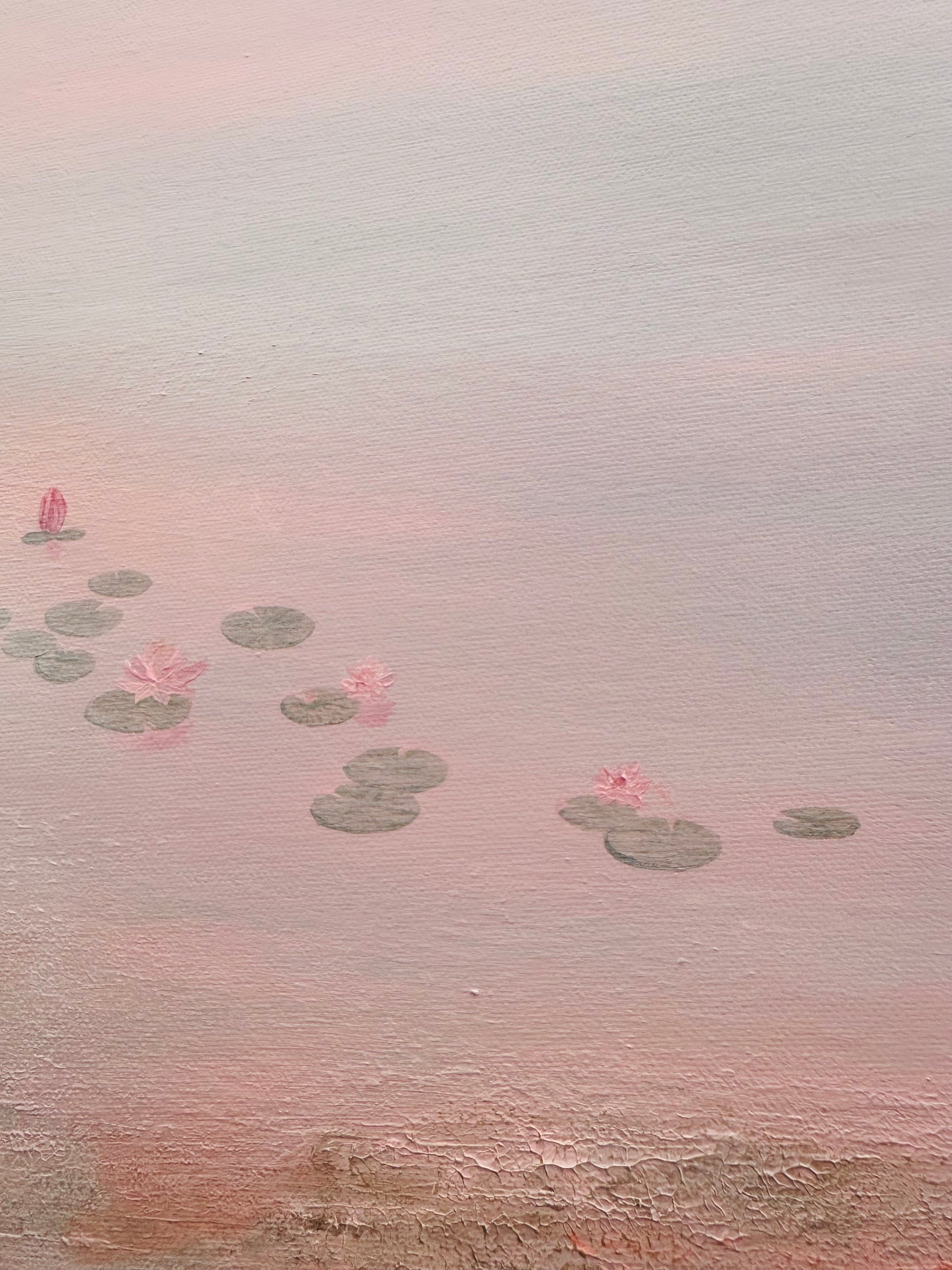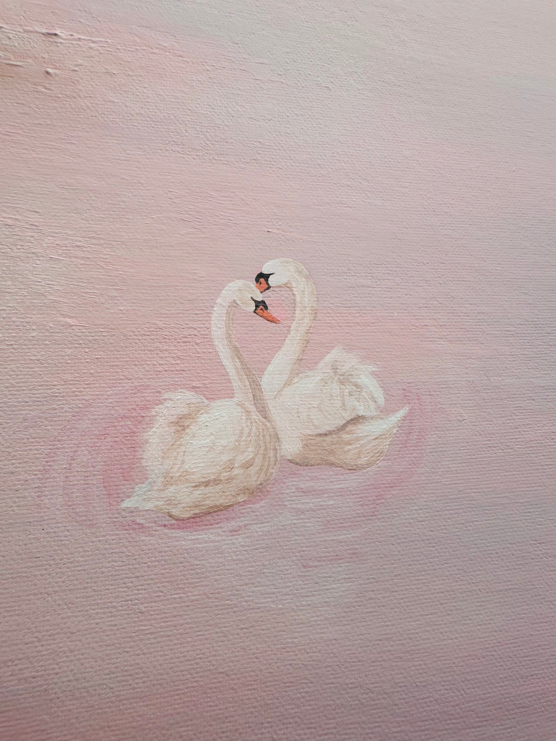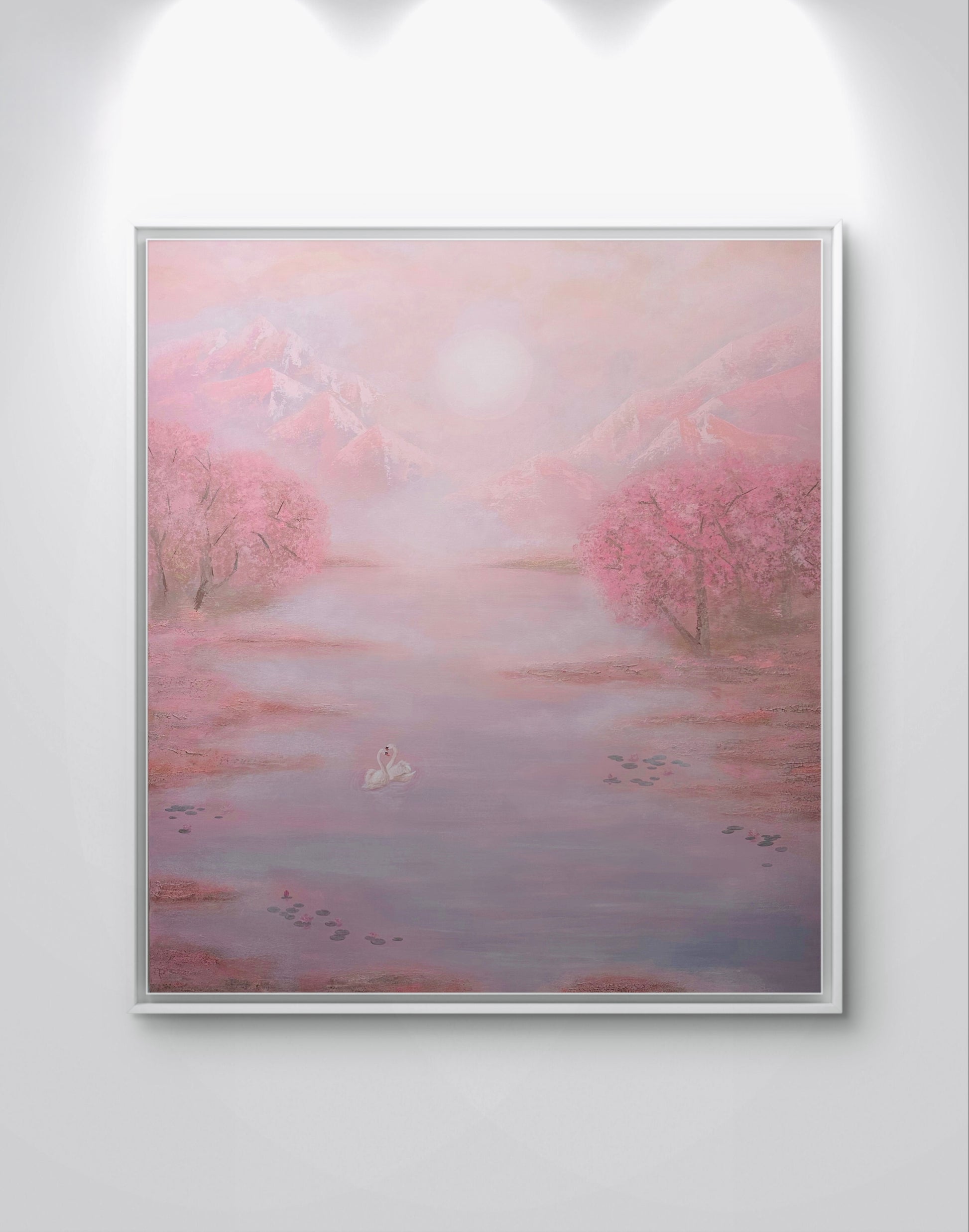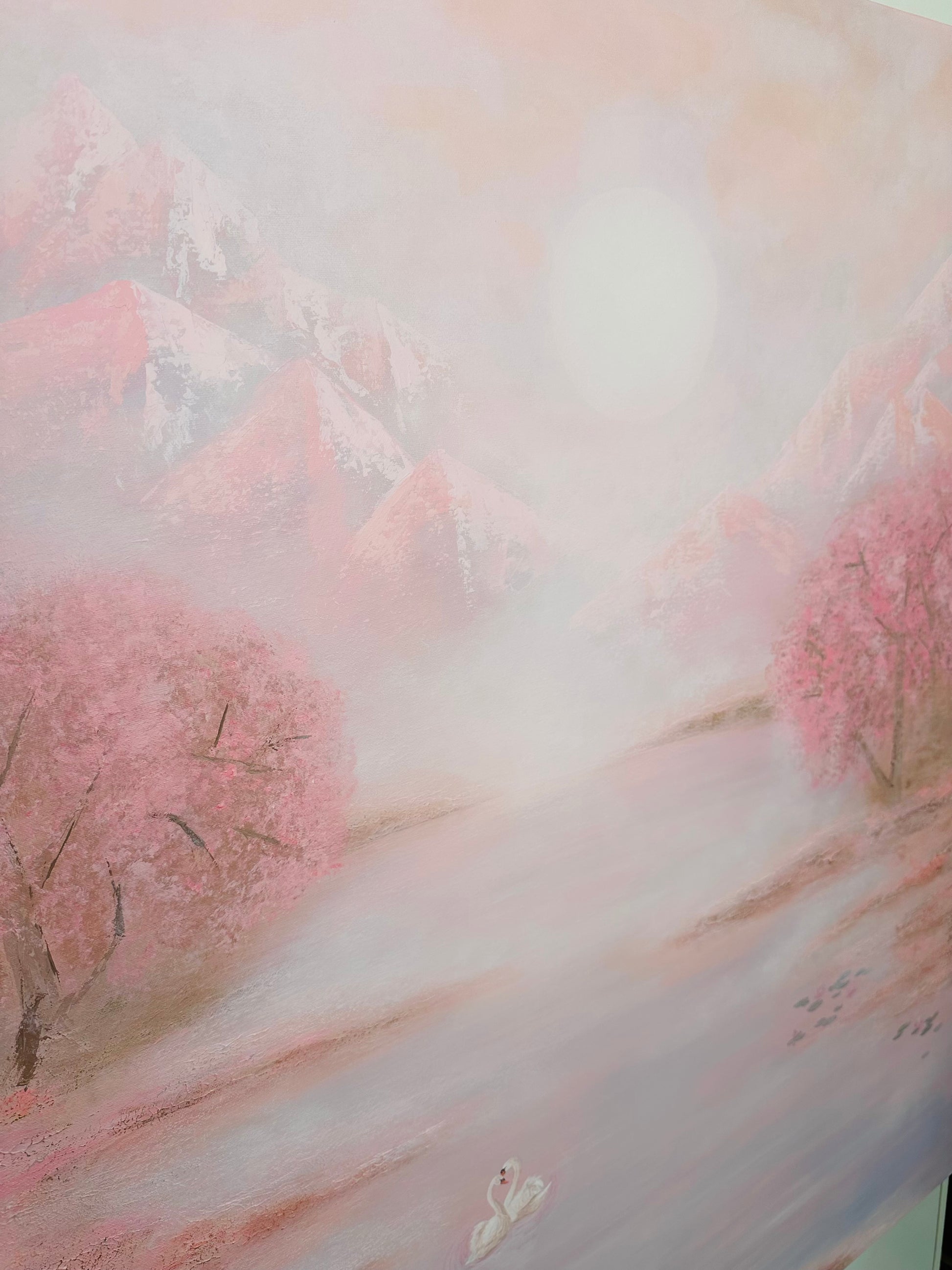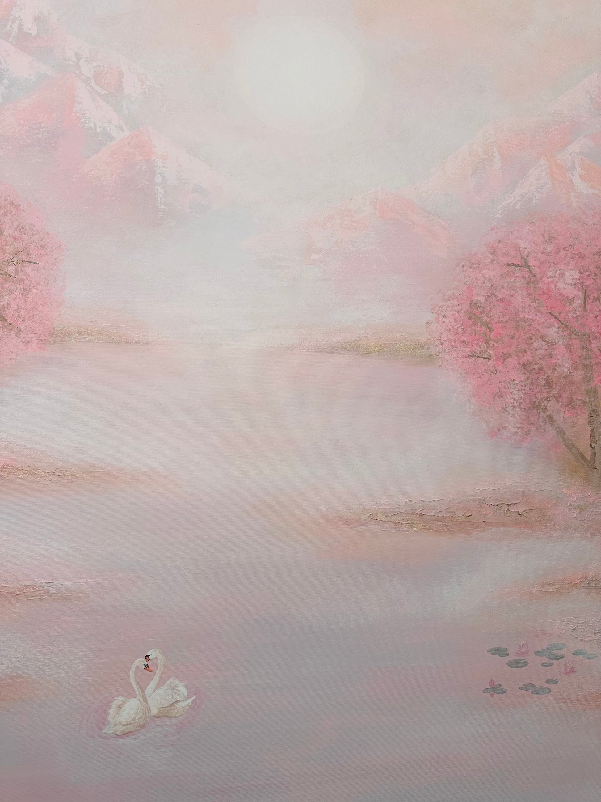 This painting captures a tranquil world suspended between reality and reverie. Soft hues of rose and mist blend to create an ethereal landscape where serenity reigns. The delicate cherry blossoms, mirrored mountains, and gentle swans evoke harmony and the quiet intimacy of nature’s embrace. This painting invites the viewer to slow down, breathe, and drift into a moment of pure calm—where every tone of pink becomes a whisper of peace and reflection.